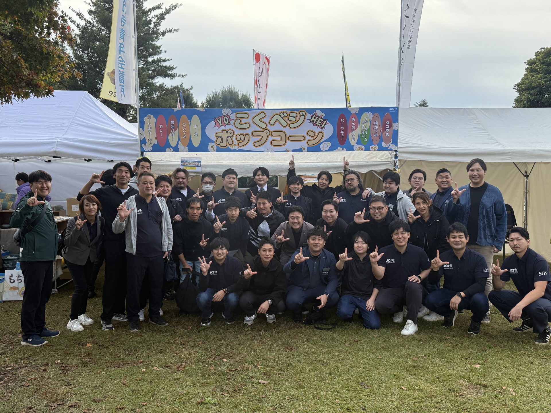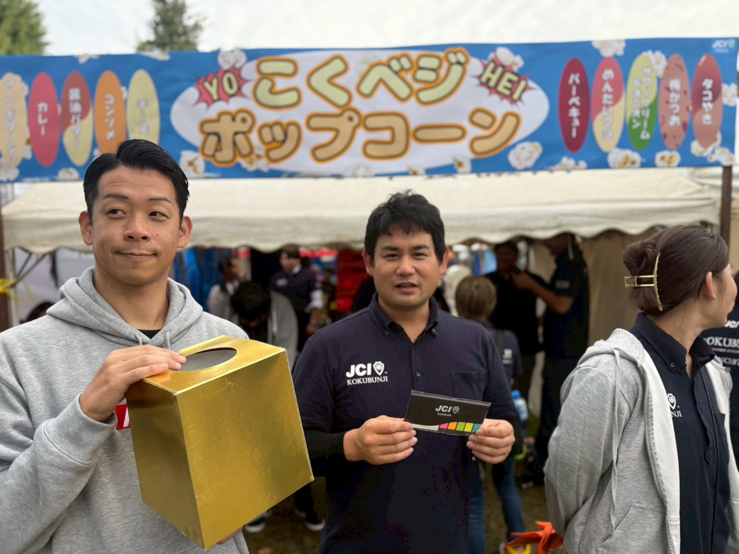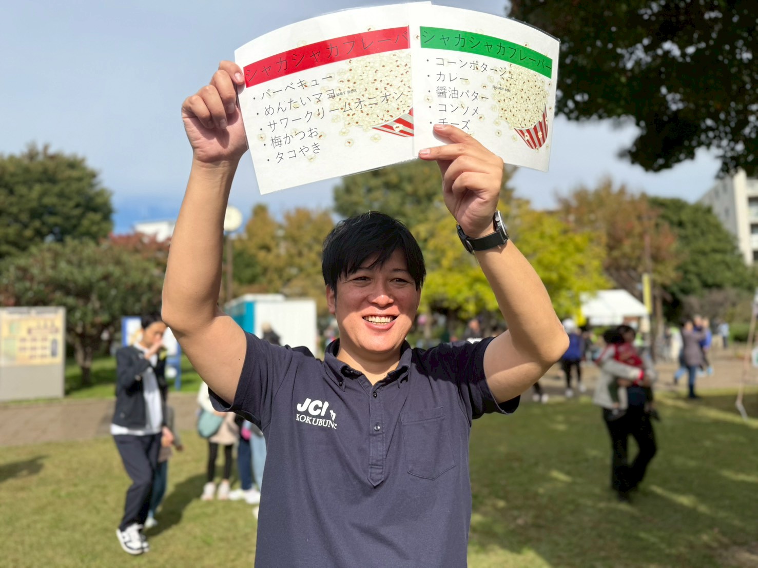 天気にも恵まれ、当年度の新人担当小委員会の小委員長から意気込みを聞いた後、今年の出店「Yo!Hei!こくベジポップコーン」を開店。